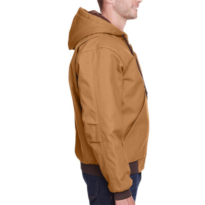 10 oz., heavy-duty cotton duck; Heavyweight quilt-lined taffeta liner; Water-repellent finish; Triple-needle stitched main seam; Heavy-duty brass zipper; Three-piece insulated hood with drawstring; Pleated action back; Pleated elbows; Two front patch pockets; Three inside pockets; Manufactured in a LEED (Leadership in Energy and Environmental Design) certified factory;