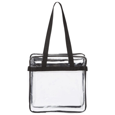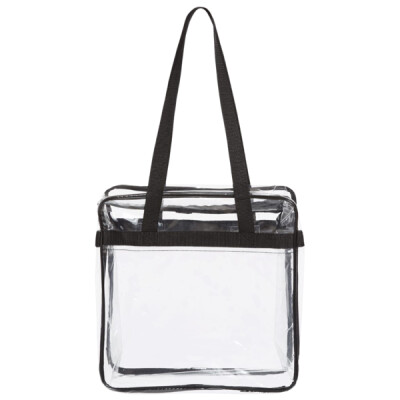 100% PVC; transparent tote bag made with double-polished; clear front pocket and double zipper pull; large double top and bottom gusset; 29.5” carrying handles; stadium compliant; 12” x 12 ”x 6”;